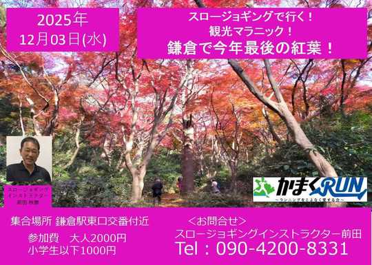 鎌倉の紅葉の見頃は、例年11月下旬から12月上旬です。気温が低い年には10月下旬ごろから葉が色づき始め、赤や黄色に色づいていきます。鎌倉は関東で最後に紅葉の見頃を迎える地域で、神社仏閣の境内などで紅葉狩りを楽しむことができます。急な上り坂はウォーキングで、また天園ハイキングコースもすべて歩きます。無理をしないのがスロージョギングですので、すべて歩いても構いません。